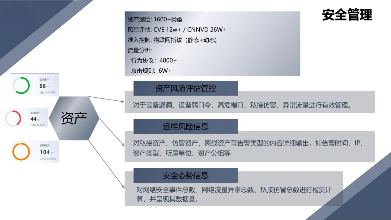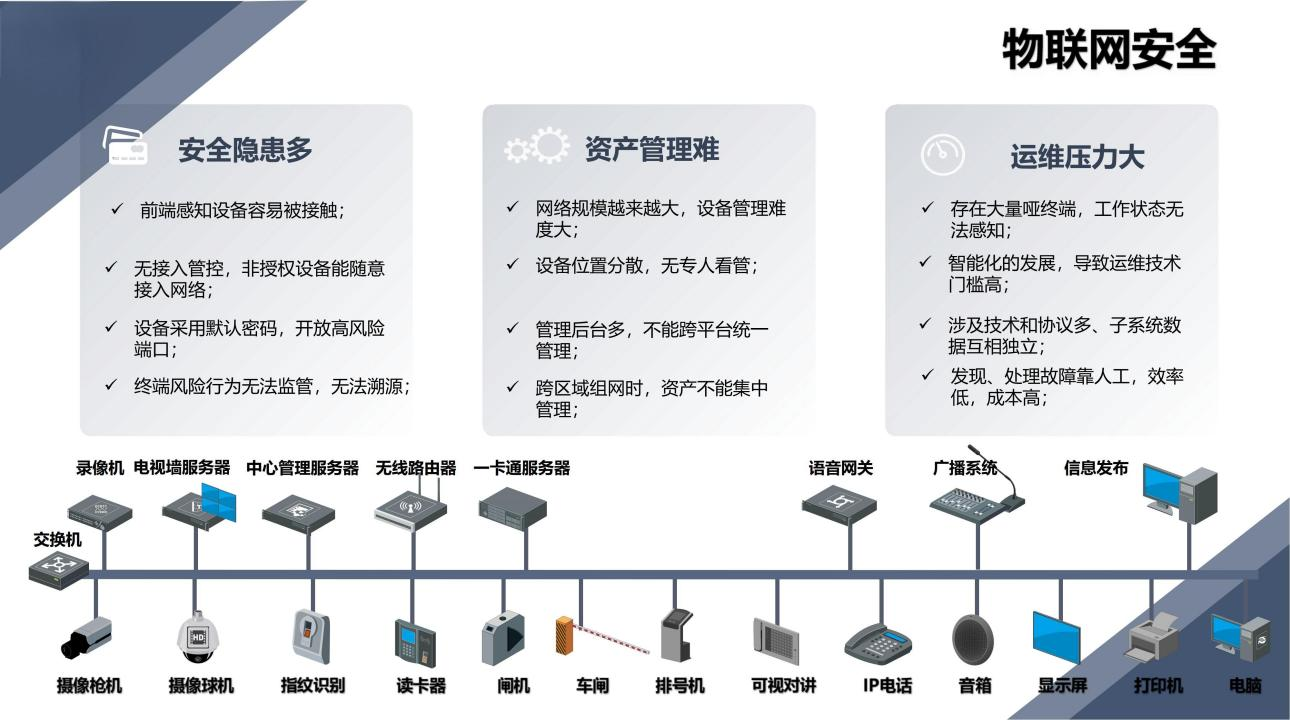 物(wu)聯網(wang)(wang)安(an)(an)(an)全準入管(guan)控及(ji)運(yun)維(wei)(wei)預警系統(tong),綜(zong)合運(yun)用資產(chan)識別(bie)、安(an)(an)(an)全準入授(shou)權、非(fei)法行(xing)(xing)為(wei)(wei)識別(bie)及(ji)攔(lan)截、視頻智(zhi)能(neng)分析及(ji)網(wang)(wang)絡AI智(zhi)能(neng)運(yun)維(wei)(wei)等技(ji)術(shu),為(wei)(wei)物(wu)聯網(wang)(wang)建立一套安(an)(an)(an)全可(ke)控、智(zhi)能(neng)運(yun)維(wei)(wei)、資產(chan)集(ji)中(zhong)管(guan)理的綜(zong)合應用平臺,做到“設備可(ke)知、入網(wang)(wang)可(ke)信、行(xing)(xing)為(wei)(wei)可(ke)控、狀態(tai)可(ke)視、故(gu)障可(ke)查”,確保安(an)(an)(an)防網(wang)(wang)安(an)(an)(an)全、穩定、可(ke)靠的運(yun)行(xing)(xing)。