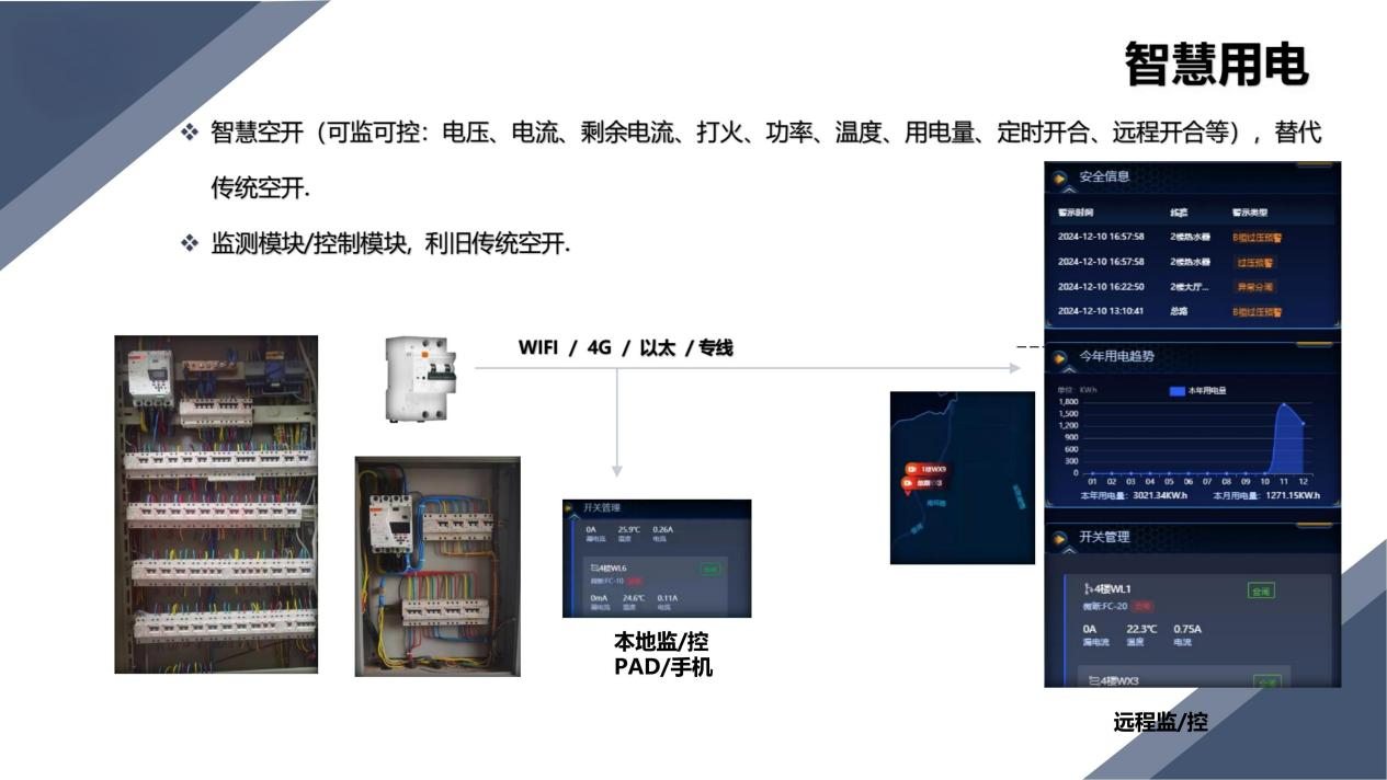 利(li)用智慧(hui)空(kong)開(可監可控:電壓(ya)、電流、剩(sheng)余電流、打火、功率、溫(wen)度(du)、用電量、定時開合、遠程開合等),替代傳統空(kong)開。