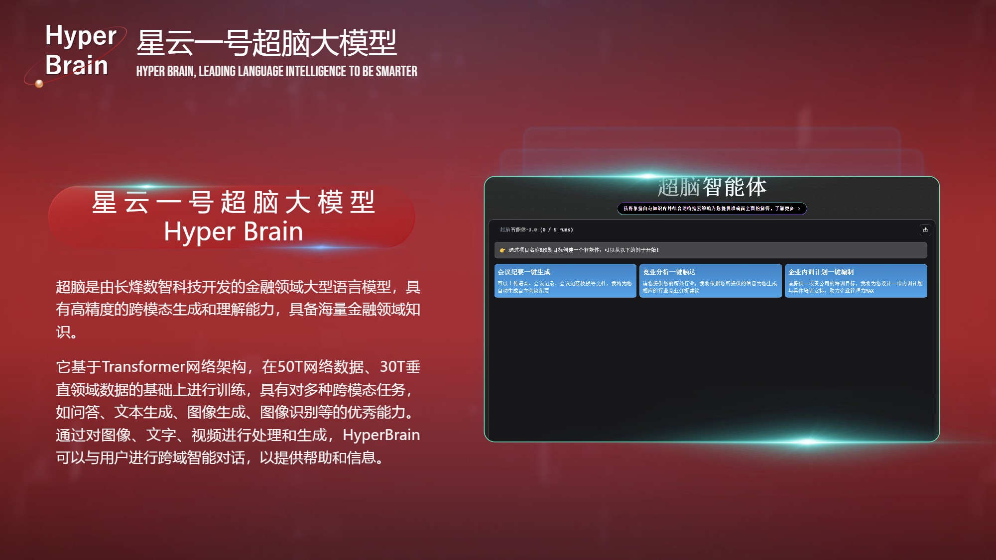 星(xing)云一(yi)號超腦大模(mo)型(Hyper Brain)是(shi)由長(chang)烽數智科技自主研發的金(jin)融領域(yu)大型語言模(mo)型。基于Transformer架構(gou),融合50T通用(yong)網(wang)絡數據與30T垂直金(jin)融數據訓練,具(ju)備跨模(mo)態生(sheng)成(cheng)與理解能力(文(wen)本(ben)、圖像、視(shi)頻)。該(gai)模(mo)型支(zhi)持智能對話、報(bao)告生(sheng)成(cheng)、風(feng)險(xian)可視(shi)化分析、智能營銷等金(jin)融場景,具(ju)備金(jin)融常識、金(jin)融法(fa)律法(fa)規等領域(yu)知識的精準性(xing)與可靠性(xing)。