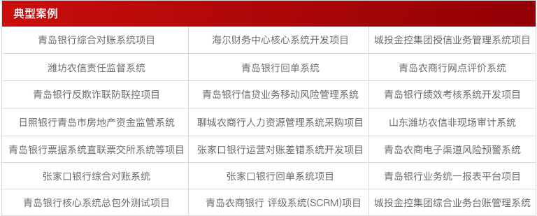 青島理工大學(xue)智慧校園(yuan)網WLAN項(xiang)目(mu) 青島銀(yin)(yin)(yin)行(xing)(xing)互聯網安(an)(an)(an)全(quan)加(jia)固(gu) 中信(xin)銀(yin)(yin)(yin)行(xing)(xing)網銀(yin)(yin)(yin)區安(an)(an)(an)全(quan)架構設計項(xiang)目(mu)